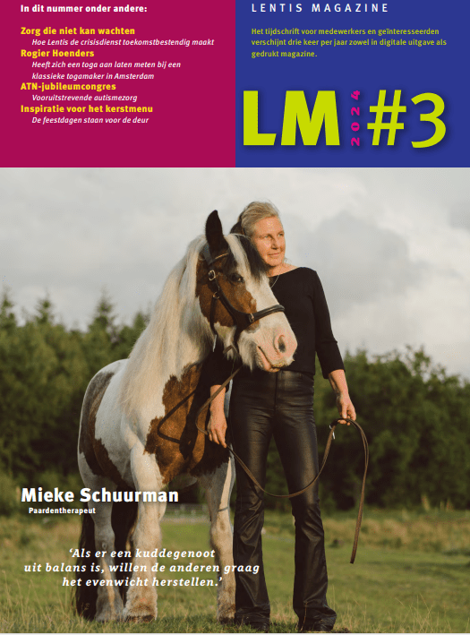 Dat paardentherapie binnen Lentis wordt aangeboden, is niet onopgemerkt gebleven. De redactie van het Lentis Magazine wilde er graag een artikel over plaatsen, en daarom interviewden ze mij. Het artikel is in de editie van december 2024 verschenen. Ik leg daarin onder andere uit wat coaching met paarden inhoudt.
