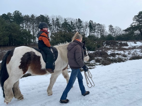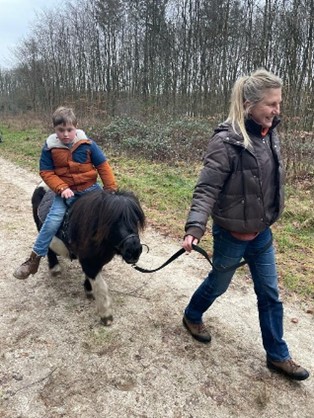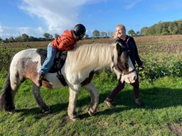 Daarna stapten we over op ontspanningsoefeningen. Blossom stond geduldig stil. Kaithlyn hing over Blossom’s rug, met haar voeten nog op de grond, en de focus op haar ademhaling. Het bracht een rust die bijna tastbaar was. Daarna klom ze op Blossom’s blote rug, iets dat ze heel spannend vond. Maar langzaam, stapje voor stapje, kwam er steeds meer ontspanning.